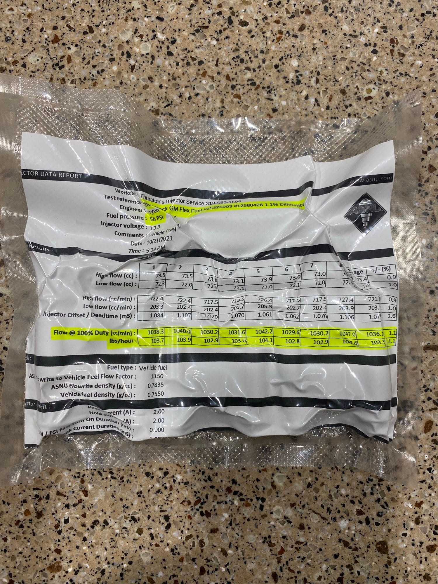 Injectors have been tested, ultrasonically cleaned, and flowed on ASNU Classic GDI. These injectors have been modified for higher flow rates and are flow matched to less than 3%. A TUNE IS REQUIRED AFTER INSTALL.