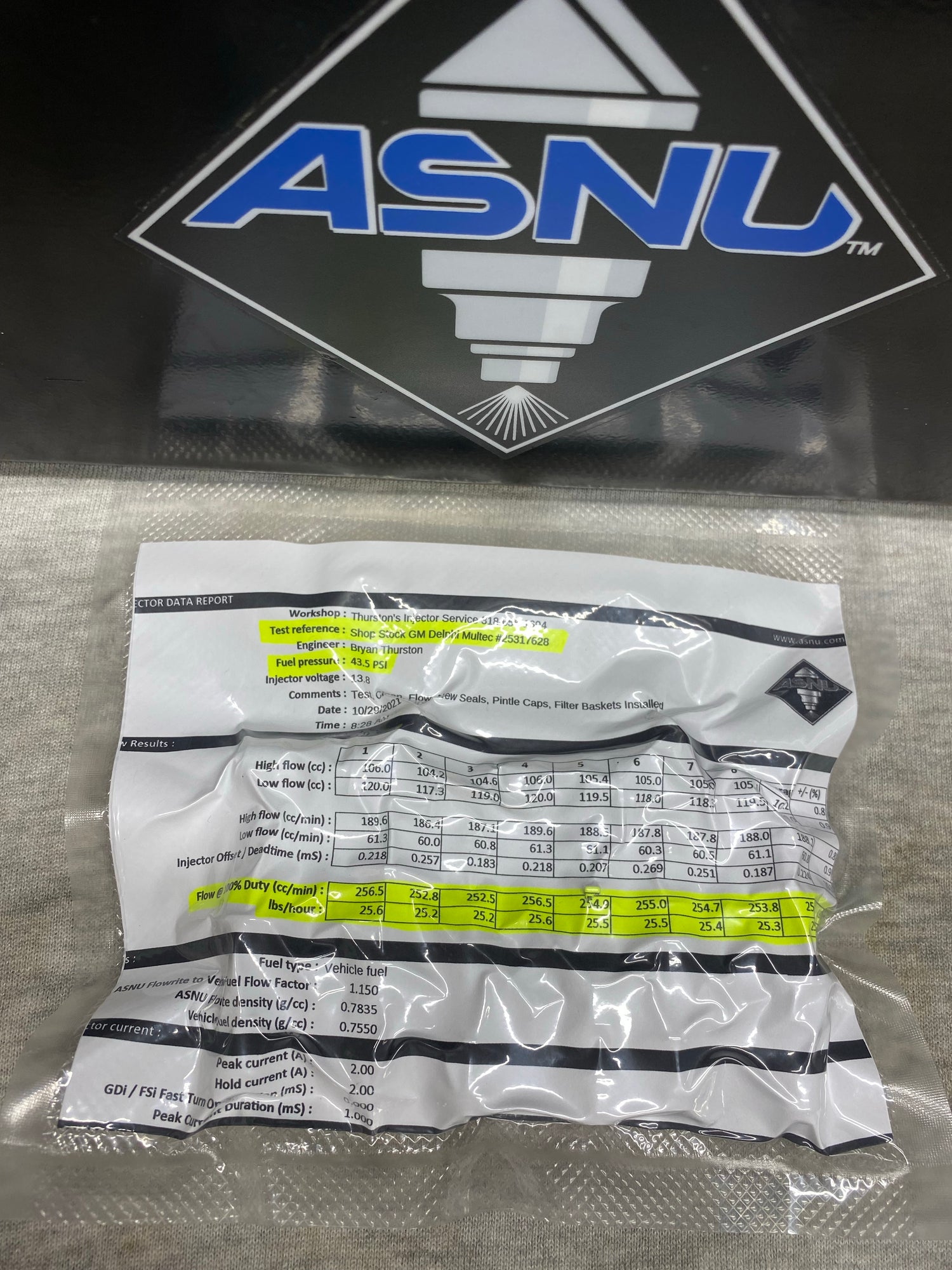 Stock GM truck fuel injectors ready to go. These injectors are used but like new, they have been ultrasonically cleaned, tested, and flowed on a ASNU Classic GDI machine. New seals and filter baskets have been installed, a flow sheet is provided.